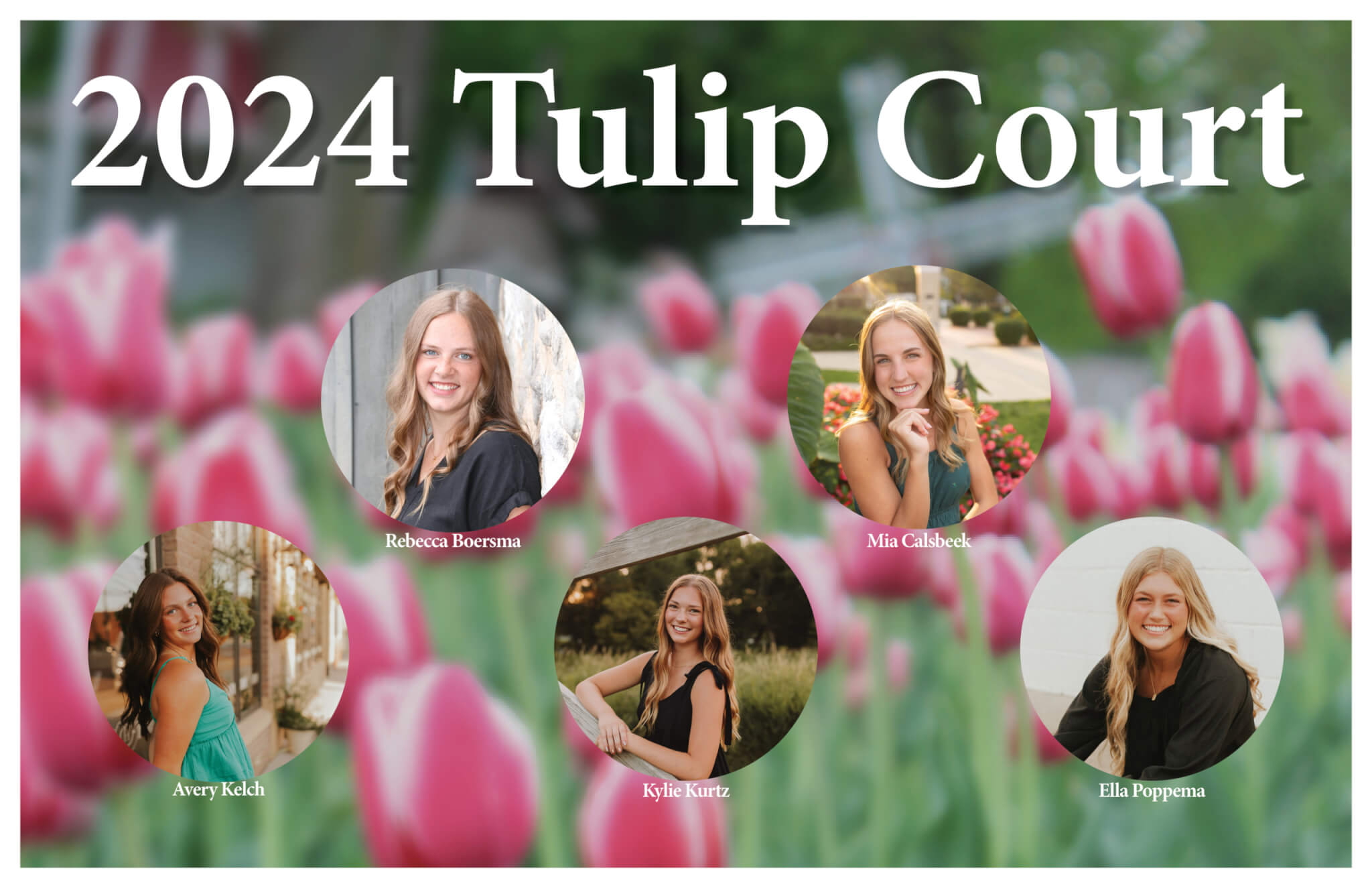 Tulip Court members for the 2024 Tulip Festival include Becca Boersma, daughter of Joel and Angela Boersma, Amelia Calsbeek, daughter of Dean and Tina Calsbeek, Avery Kelch daughter of Reese and Cristi Kelch, Kylie Kurtz, daughter of Vince and Laurie Kurtz, and Ella Poppema daughter of Joe and Gina Poppema.