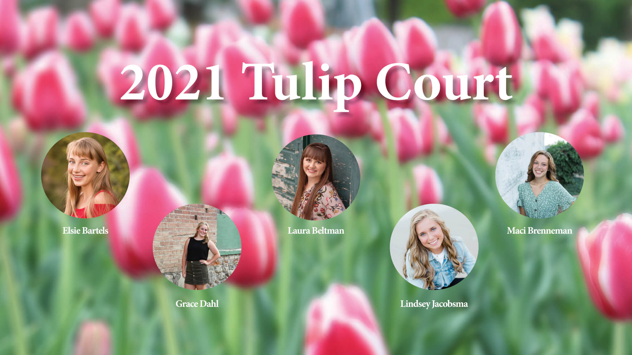 Tulip Court members for the 2021 Tulip Festival include: Elsie Bartels, daughter of Eric and Vanessa Bartels, Laura Beltman, daughter of Daryl and Shirley Beltman, Maci Brenneman, daughter of Patrick and Dana Brenneman, Grace Dahl, daughter of Rik and Amy Dahl, and Lindsey Jacobsma, daughter of Melinda Jacobsma and the late Randy Jacobsma.